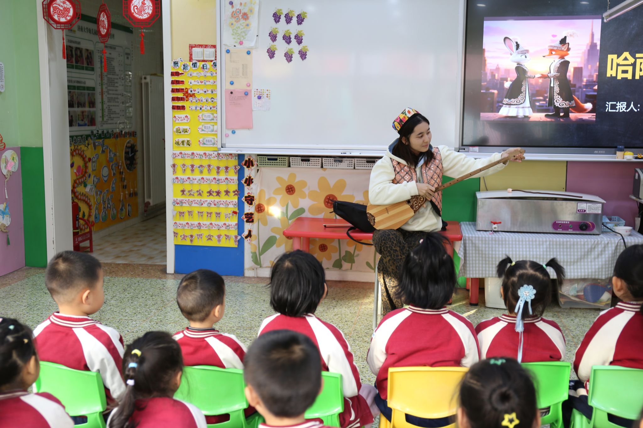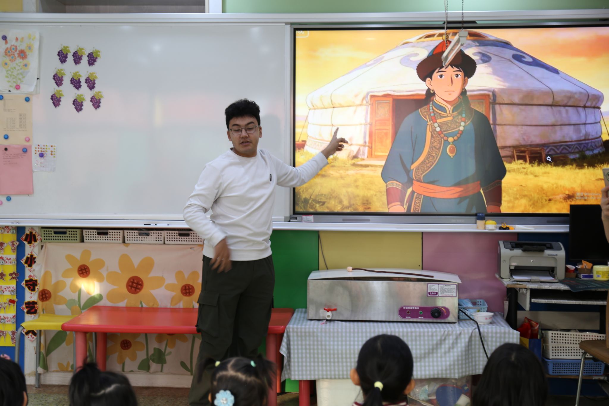 附属幼儿园主持实践活动,我们带着小朋友们认识少数民族的乐器、歌舞与美食。他们眼中的好奇与热情,让我真切感受到童真的美好;当小朋友们与我们共舞、小心翼翼地抚摸特色乐器时,我清晰地看到民族团结的种子正在他们心中萌芽。在这次实践中,我们用自己的力量让孩子们感知到民族大家庭的温暖,既自豪又深感责任在肩,也更坚定了用青春践行民族团结的决心。”实践队成员麦迪娜・麦尔旦说道:“这场活动让我收获满满。看着小朋友们睁着好奇的眼睛,围着我们询问少数民族的服饰、美食,跟着我们学跳民族舞蹈,我真切感受到民族团结的种子扎根童心的力量。我们通过生动的讲解、趣味的互动,把多彩的民族文化展现在孩子们面前。这次实践活动不仅是向幼儿传递民族知识,更让我自身对‘铸牢中华民族共同体意识’有了更为深刻的理解。未来,我也会继续用青春力量,传播民族团结的美好理念。”