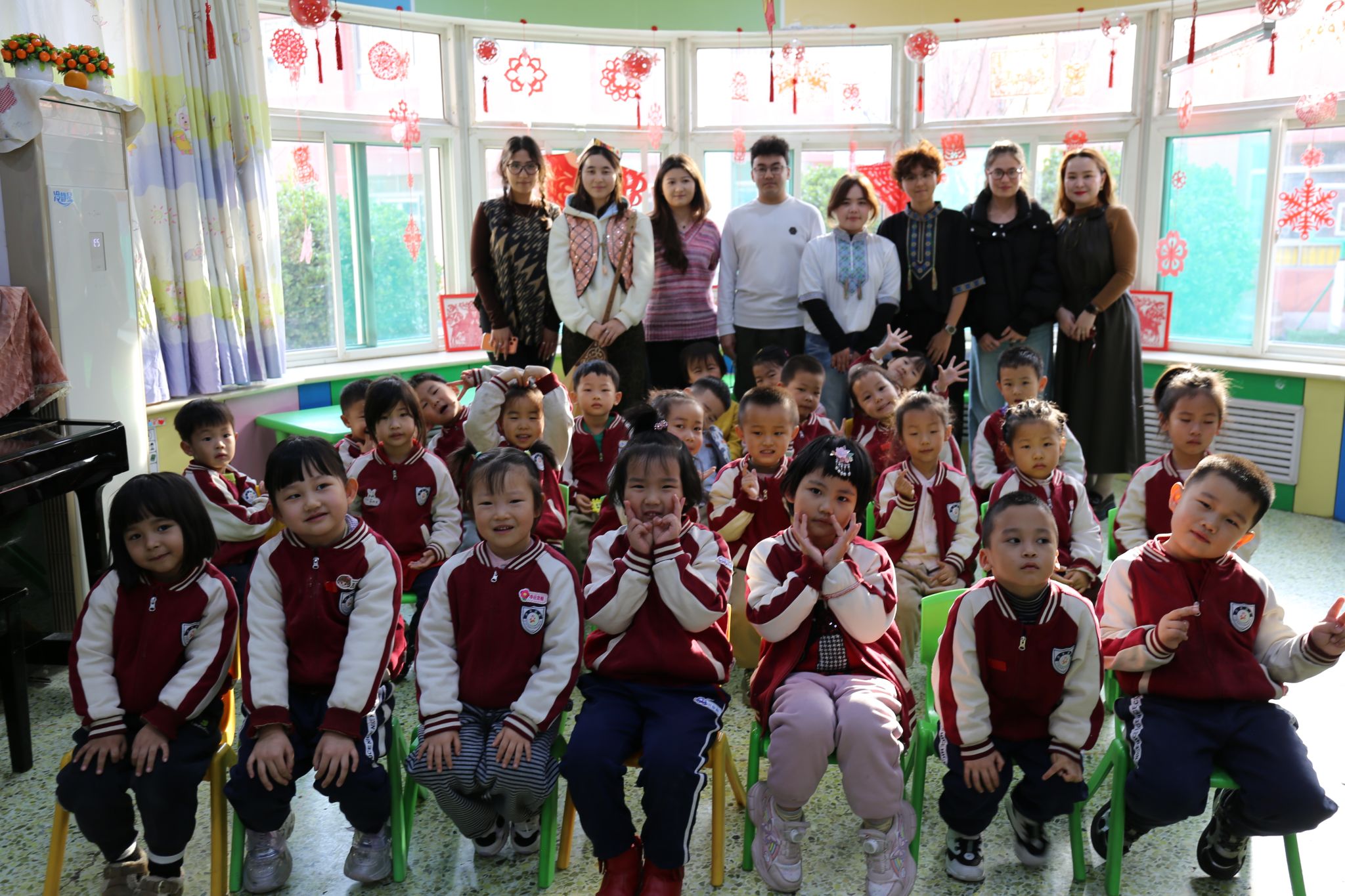 实践团成员围绕“认识少数民族”“了解少数民族风俗习惯、特色美食、传统乐器与歌舞”等主题各展所长,将民族团结理念融入生动活泼的教学环节,为幼儿带来了丰富精彩的教育体验。队员们充分调动幼儿学习的积极性与主动性,引导孩子们在玩中体验、在乐中感悟、在互动中学习。志愿者们分组开展活动:教小朋友们跳民族舞蹈、学说简单的民族语言、体验弹奏民族乐器等。石榴树下,大手牵小手共舞共学,掌心相触的温度让 56 个民族的团结故事悄然萌芽。一张张真诚的笑脸、一双双挥动的小手、一阵阵灵动的旋律,构成了各民族交往交流交融最动人的画面。这一刻,不同民族同心同向,“大学生” 与 “小朋友” 的距离也在欢声笑语中不断拉近。