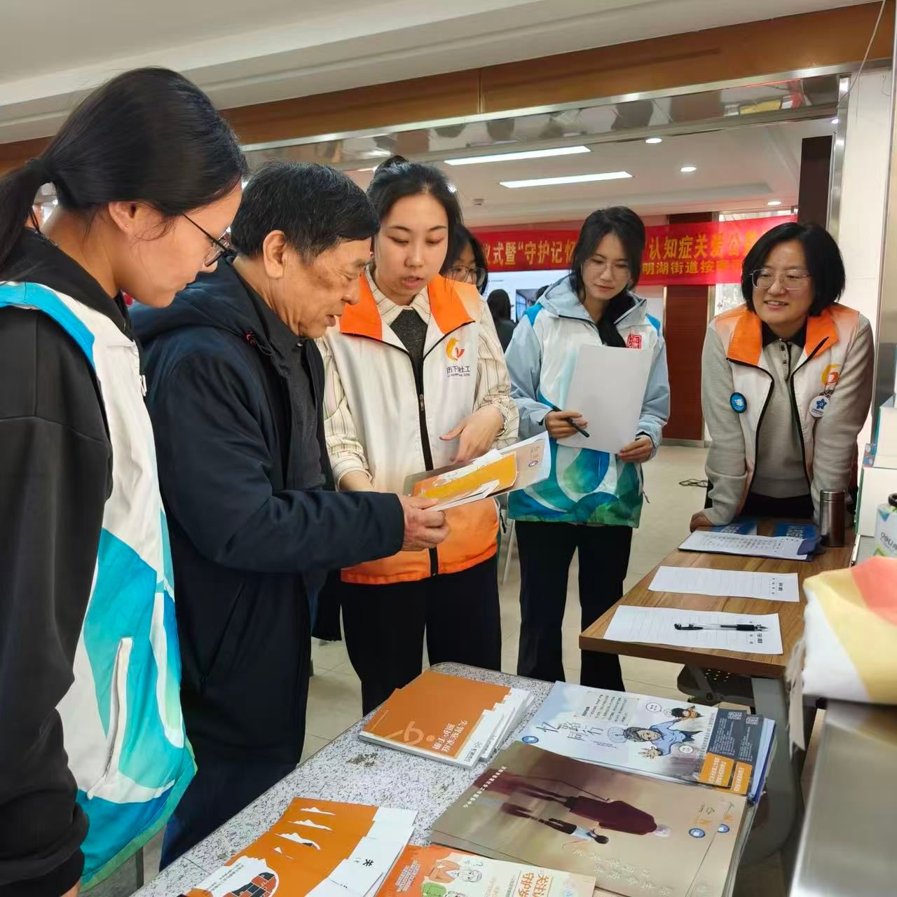社工专业实习生充分发挥专业优势,全程高效协助开展各项服务工作。在公益义诊环节,实习生们紧密配合山东大学齐鲁医院神经内科刘双武主任带领的专业医护团队,有序引导老年人排队咨询、协助整理诊疗资料、细致记录老人咨询信息,用耐心细致的服务缓解了老人们的紧张情绪;在健康宣讲环节,实习生们主动承担科普宣传任务,向过往老人发放认知症早期识别科普单页、《家属照护手册》,用通俗易懂的语言讲解认知症预防、早期识别及家属照护技巧,耐心解答老人们及家属的疑问。