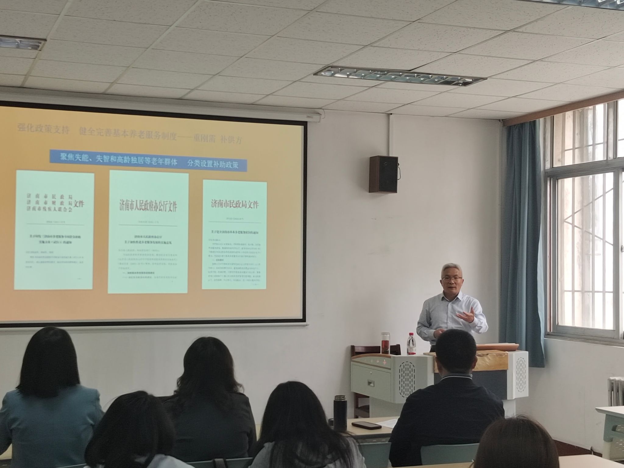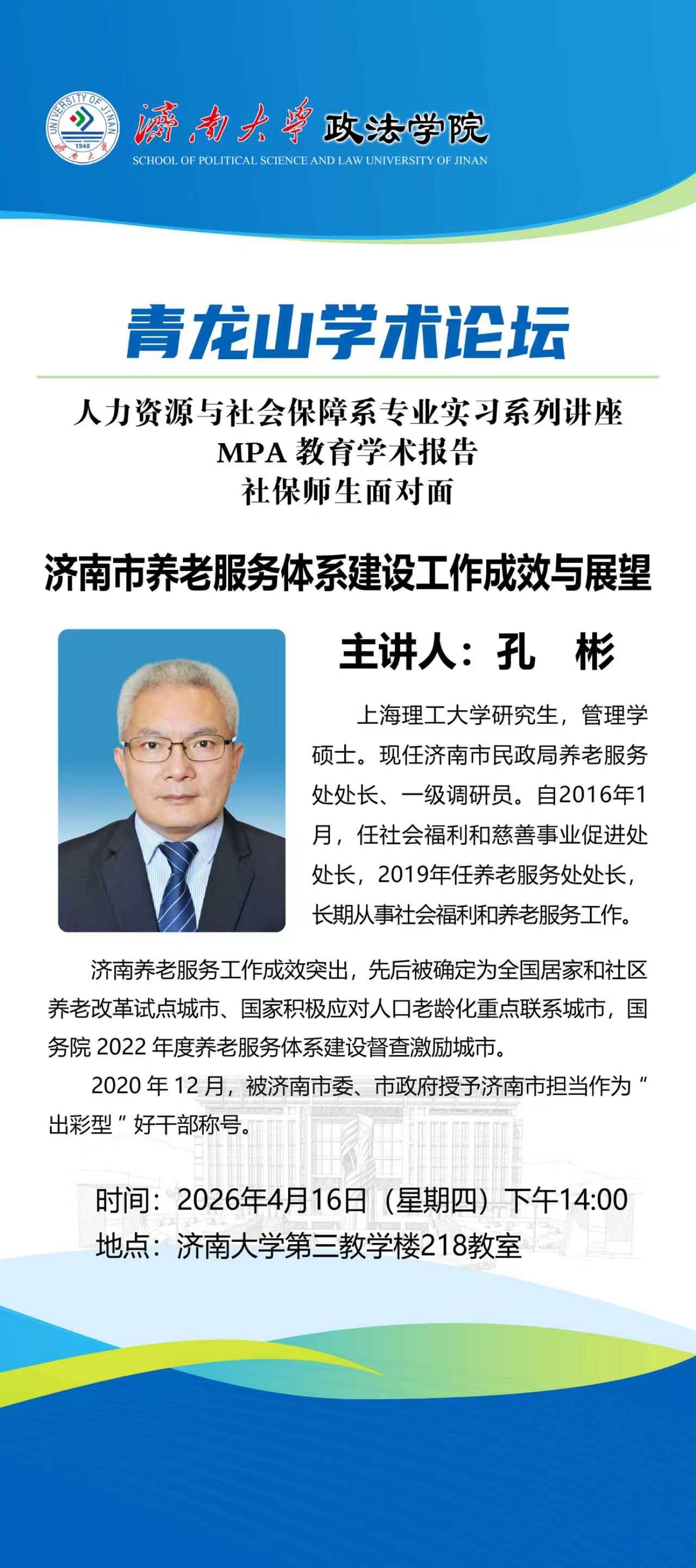 人力资源与社会保障系结合认识实习周安排,邀请济南市民政局养老服务处处长、一级调研员孔彬莅临我校为2024级学生开展养老服务专题讲座。