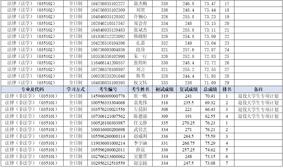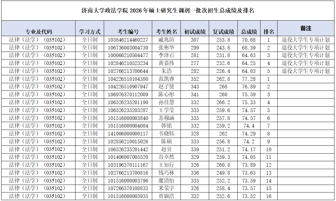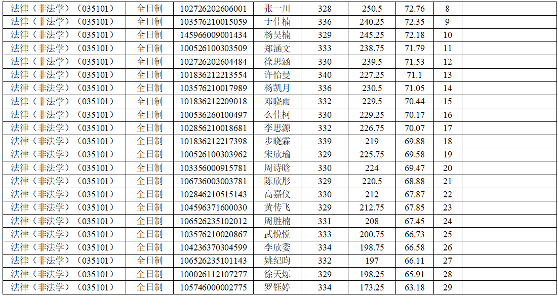 2026年硕士研究生复试录取工作方案》的相关要求和部署,学院于2026年4月9日进行了法律(法学)(035102)、法律(非法学)(035101)硕士研究生招生调剂志愿一批次复试工作。现将考生成绩及排名予以公示。