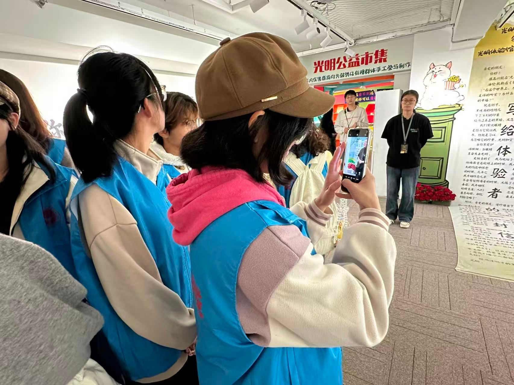 教学环节结束后,志愿者们参观了残障人士手工艺品展区。精美的刺绣作品和生动的彩绘创作不仅体现了创作者精湛的技艺,更彰显了残障群体克服身体限制、积极面对生活的昂扬精神风貌。