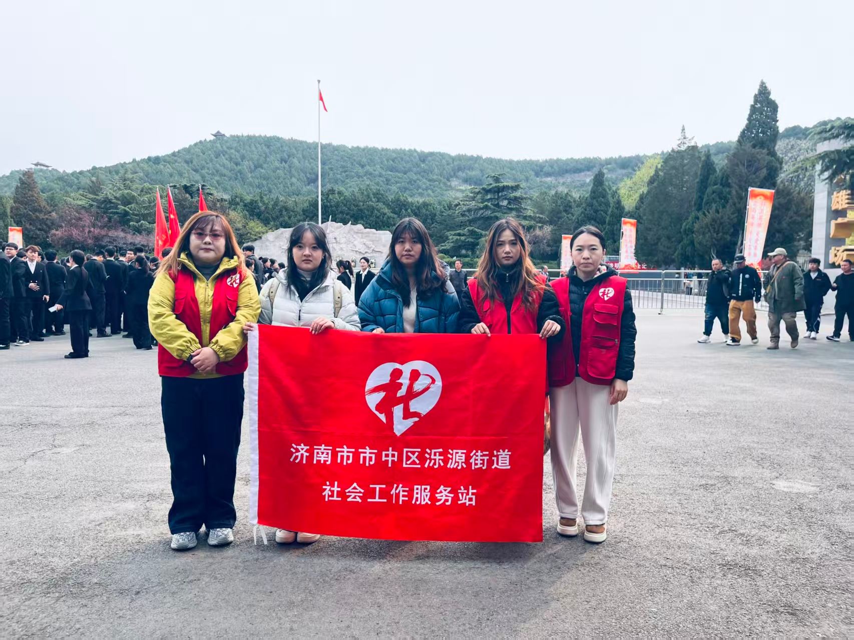 2023级社会工作专业实习生参与泺源街道社工站联合多部门在济南英雄山革命烈士陵园开展的“纸花祭英烈,同心铸忠魂”清明追思英雄活动,学子们以专业社工服务为抓手,将红色教育与基层实践深度结合,在缅怀革命先烈中厚植家国情怀,在一线服务中锤炼专业素养。