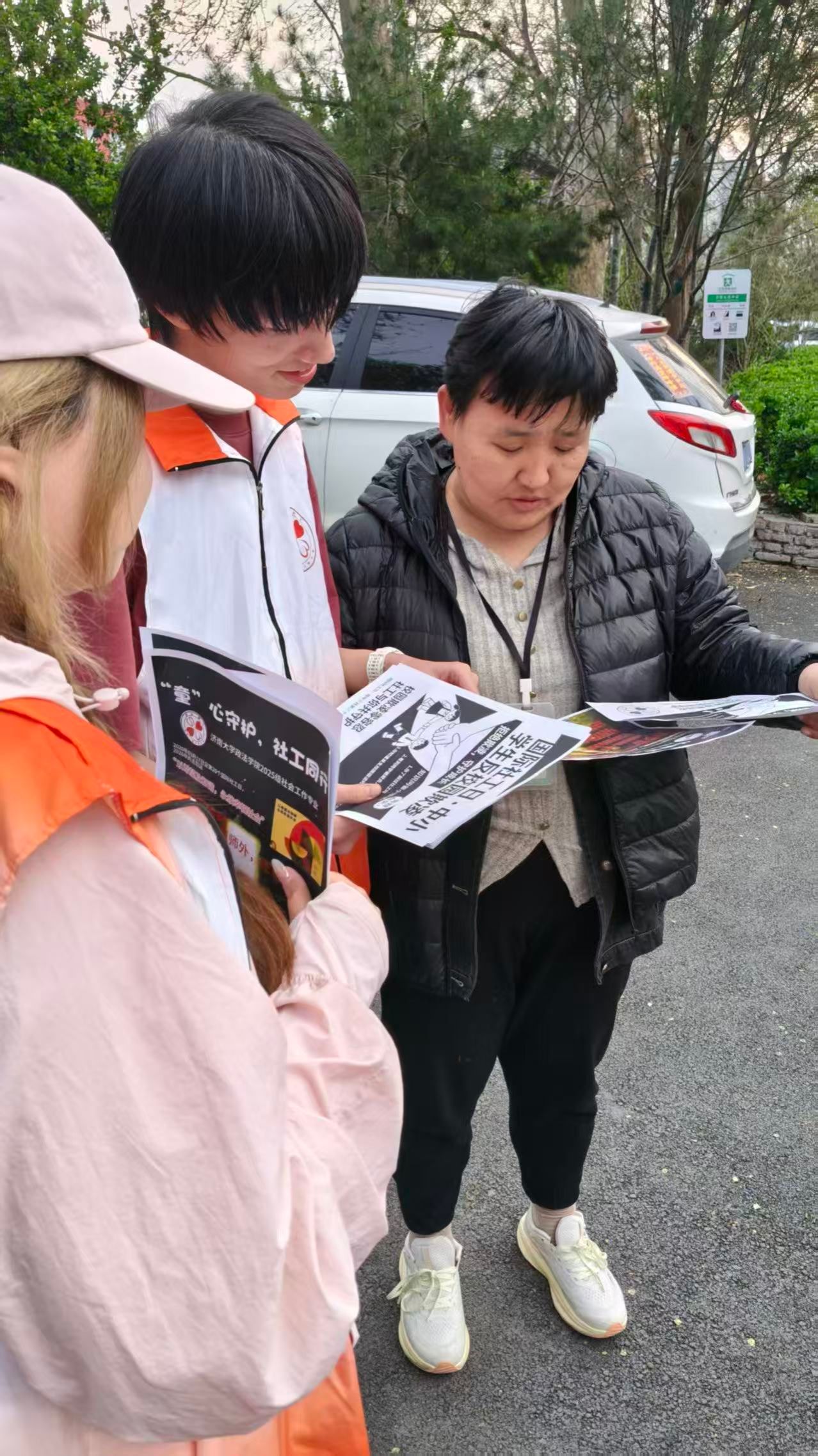 活动现场,团队成员分工协作,同步开展宣传与访谈工作。一方面,志愿者向过往学生与家长发放反校园欺凌宣传单,清晰讲解欺凌识别方法、危害及应对原则;另一方面,围绕社工认知、校园欺凌应对方式、求助渠道等问题开展非结构式访谈,深入了解受访者认知现状。现场反馈显示,家长与学生对校园欺凌问题高度关注,但对社工专业角色认知有限。团队结合访谈情况针对性科普,详细讲解遭遇欺凌时可寻求社工帮助、拨打未成年人保护热线、对接社区与政府部门等多元途径,引导大家正视欺凌危害、掌握维权方法,强化反欺凌意识。