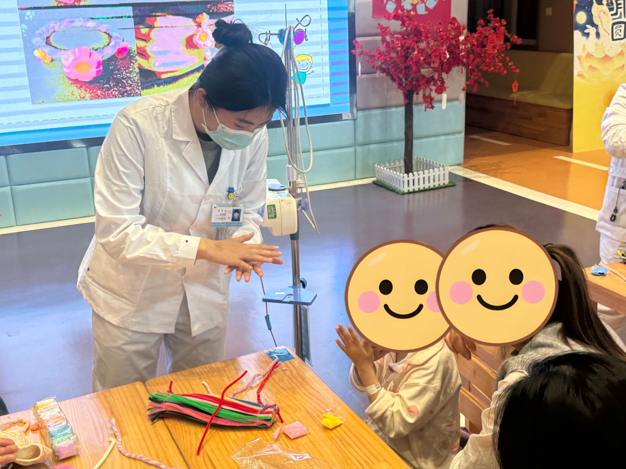社会工作专业实习生在山东省肿瘤医院儿科活动中心,开展“小手握春天,童趣满心间”春日手工主题活动,与患儿、医护人员携手共度欢乐的时光。